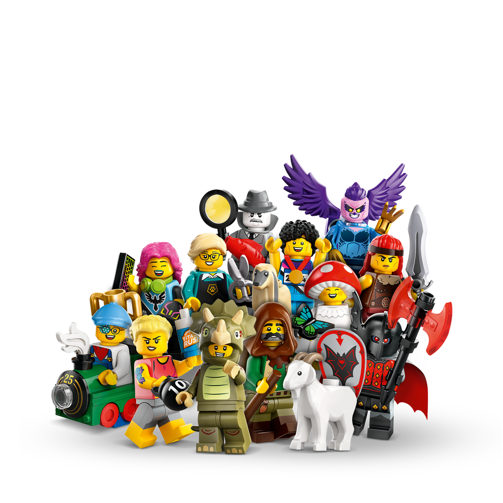 There is 1 surprise LEGO minifigure in each box and a total of 12 characters to collect: Triceratops Costume Fan, Sprinter, Film Noir Detective, Train Kid, Goatherd, Vampire Knight, Pet Groomer, Fitness Instructor, E-Sports Gamer, Mushroom Sprite, Fierce Barbarian and Harpy.