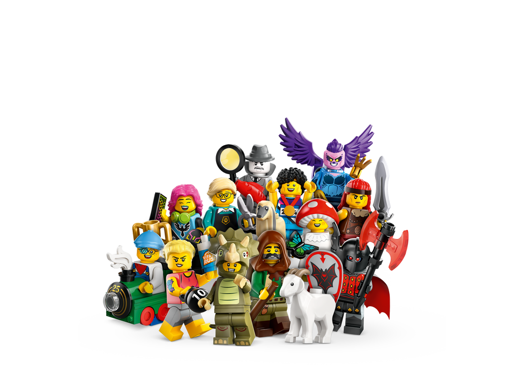There is 1 surprise LEGO minifigure in each box and a total of 12 characters to collect: Triceratops Costume Fan, Sprinter, Film Noir Detective, Train Kid, Goatherd, Vampire Knight, Pet Groomer, Fitness Instructor, E-Sports Gamer, Mushroom Sprite, Fierce Barbarian and Harpy.