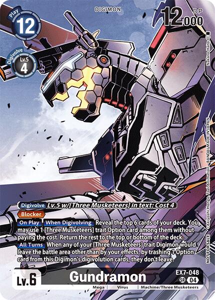 [On Play] [When Digivolving] Reveal the top 6 cards of your deck. You may use 1 [Three Musketeers] trait Option card among them without paying the cost. Return the rest to the top or bottom of the deck.